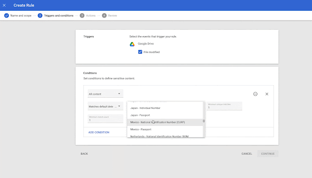 - Integración de la clasificación automatizada y la Prevención de pérdida de datos (DLP) de Drive. La clasificación automatizada puede ayudar a las organizaciones a agregar automáticamente etiquetas de Drive en contenido según reglas definidas por el administrador y detectores de contenido predefinidos.