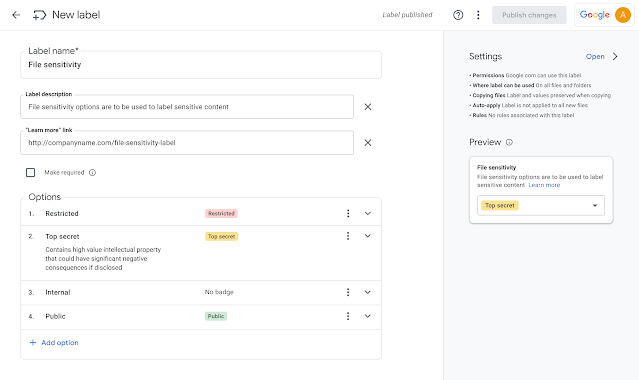 - Etiquetas de Drive. Cambiar el nombre y actualizar la función de metadatos de Drive que ya habíamos anunciado les permite a los administradores configurar etiquetas personalizadas (anteriormente “metadatos”) en un dominio y también les permite a los usuarios aplicar esas etiquetas en archivos de Drive.